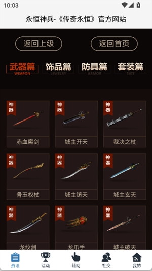 4、进入神兵板块,可以查看武器,道具等内容。