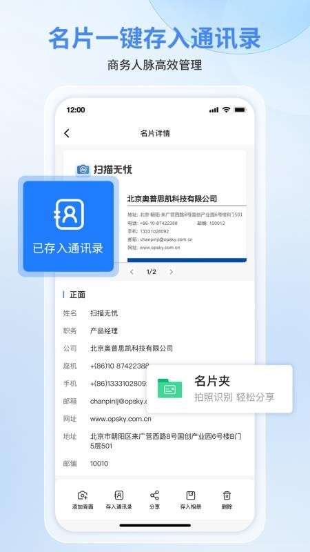 2.名片扫描后自动识别联系人信息,一键存入名片夹,无需手动。